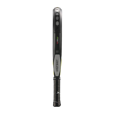 La Drop Shot Axion Comfort destaca por su elegante combinación de tonos grises con detalles en amarillo, aportando un estilo llamativo y actual. Además, la firma de Jon Sanz está plasmada en la cara de la pala, otorgándole un valor exclusivo y distintivo.